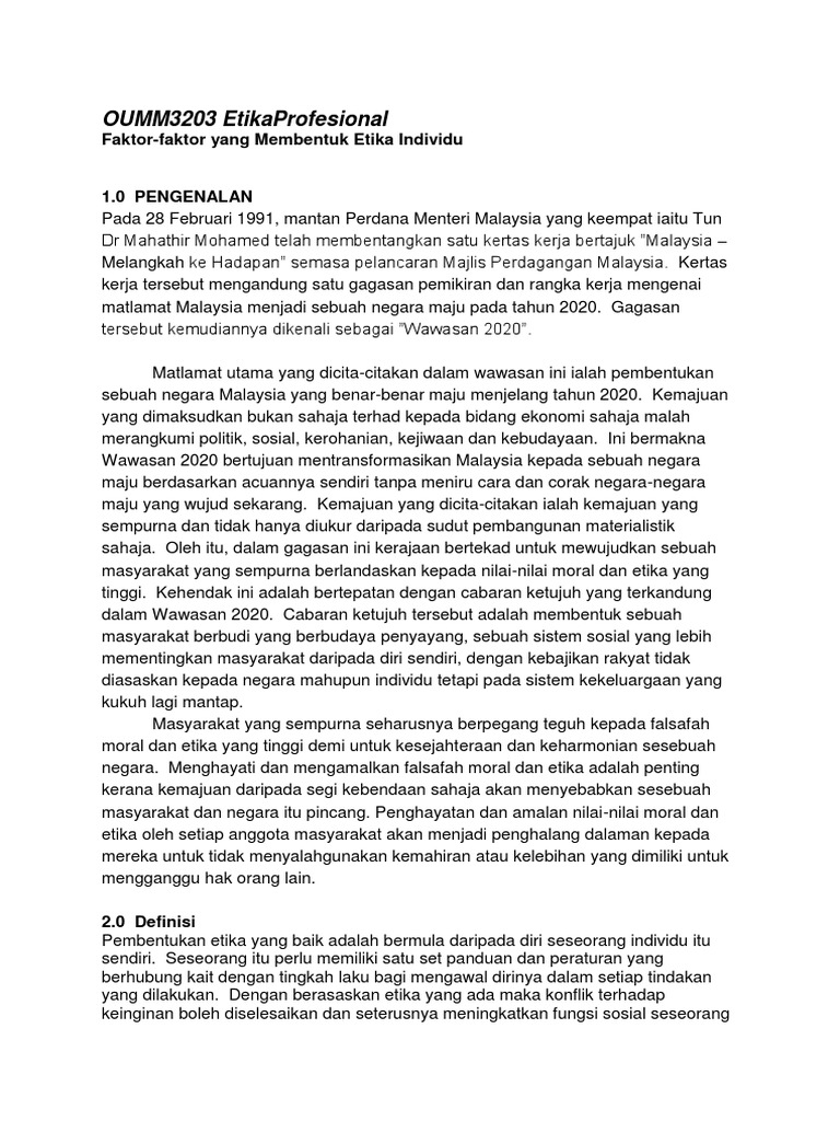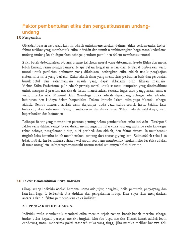 Http 202 0 92 5 Syariah Azzarqa Article Download 1315 1136 from Keadaan sekeliling juga merupakan faktor yang menyumbang kepada pembentukan etika seseorang individu itu menjadi positif atau negetif. 2.0 faktor pembentukan etika individu. Analisis keperluan integriti dan etika dalam kehidupan 13. Nilai peribadi dan prinsip moral. Faktor dan kesan daripada kemerosotan integriti 10. Kanak kanak lebih berkemungkinan akan menerap piawaian etika yang tinggi apabila mereka melihat ahli keluarga mereka berpegang kepada piawaian yang tinggi seperti bercakap benar. Pembentukan integriti dalam kalangan staf dan kakitangan awam 12. Ini bermakna bahawa walaupun apa yang membentuk tingkah laku beretika adalah di mata orang lain, ia biasanya mematuhi norma sosial umumnya boleh diterima.