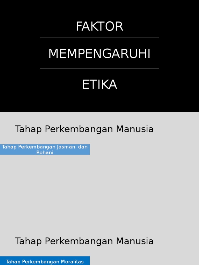 • pekerjaan • tahap pendidikan • tempat tinggal; Antara berikut merupakan faktor pembentukan etika individu kecuali: Perilaku dan kebiasaan individu yang terakumulasi dan tak dikoreksi 4. Salam sejahtera, etika adalah penting dalam kehidupan manusia kerana ia membantu kepada pembentukan keharmonian, kesejahteraan, kerukunan dan kedamaian hidup. Lingkungan yang tidak etis 5.